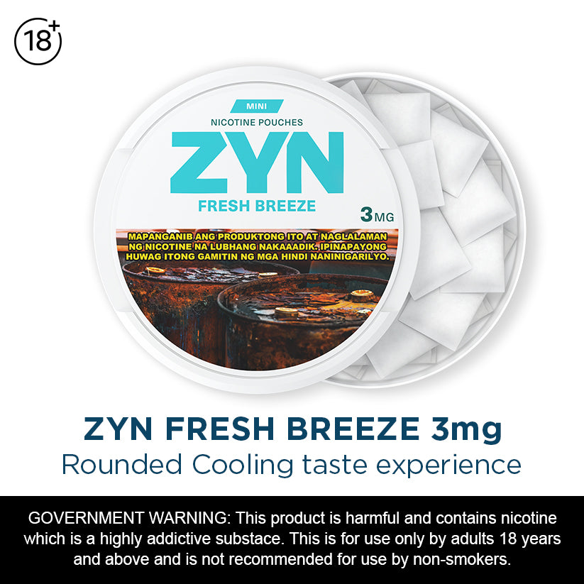 ZYN Fresh Breeze is a rounded cooling taste experience in a mini pouch size. Available in 1.5mg, 3mg, & 6mg. The regular pouch is soft and comfortable under your lip, it is designed to deliver an instant burst of taste. You may feel a tingling sensation, that’s an expected part of the experience. Each can contains 15 nicotine pouches. You can keep the used pouches in the compartment on the lid and dispose responsibly later.